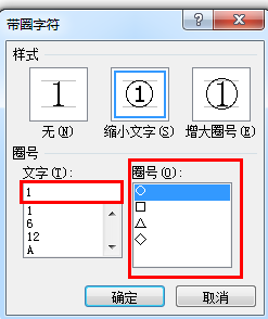 3、弹出圈字符对话框,在圈号处选择方框;在样式处选择增大圈号即可,