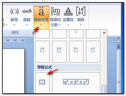 4、点击插入新公式命令以后,找到并点击导数符号下拉选项的带框公式即可。