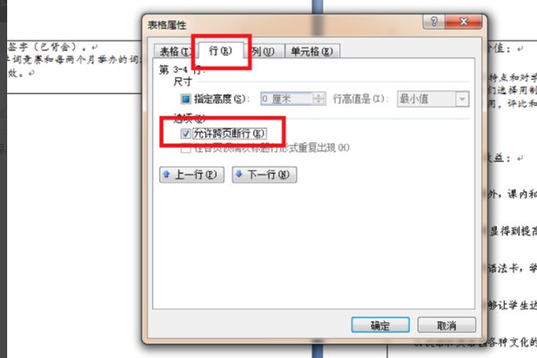 3、然后我们在表格属性对话框中,选择“行”,在“允许跨页断行”前选中确定即可。