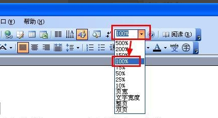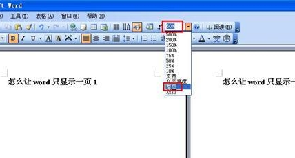 2.第二种是显示了双页,即左边一页,右边一页,这种情况在2003版本中是在显示比例中设置的,如图,取消方法是选择“显示比例”下拉中的整页,点击就可以取消只显示一页,再点击就会出现双页。