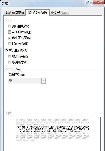 3、在弹出的对话框中单击“换行与分页”选项卡,勾选“段中不分页”,单击“确定”。