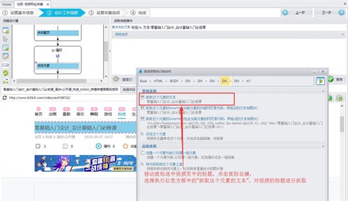 移动鼠标到视频标题处,右键点击,选择执行红色方框中的“抓取这个元素的文本”,对视频的标题进行抓取