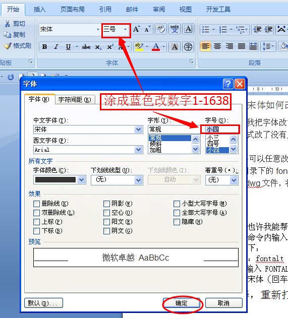 1、直接选中文字,右击调出“字体”(如果面板上有字体功能直接使用),在字号里将字号涂成蓝色改数字(取值范围:1-1638)磅,数字越大字越大。