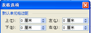 3,在弹出的表格选项对话框,将单元格边距的上、下、左、右的值都设置为:0厘米,如图所示。