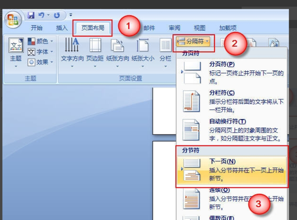 1,打开word2007,点击“页面布局—>分隔符—>分页符”命令,操作这一步word表面上看不出有什么变化,但是为后面插入横向页面做准备的。