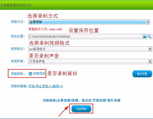 设置录制方式,再设置录制视频的保存位置和录制视频的格式,接着选择录制声音的类型,以及是否录制鼠标等。设置好后点击“开始录制”。