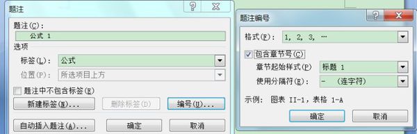 光标放在公式之后,不要(注意是“不要”)选中公式,在“插入|引用”菜单选“题注”(2007中是引用-插入题注),由于没有选中项目,所以“位置”一项为灰色,新建标签“公式1-”,在编号一项选中包含章节号,点击“确定”。