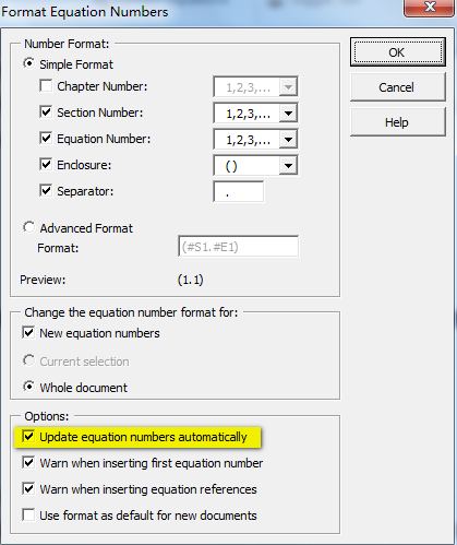 1、在Insert Number里的Format Equation Numbers对话框里下面选项Options里有自动更新公式编号选项。
