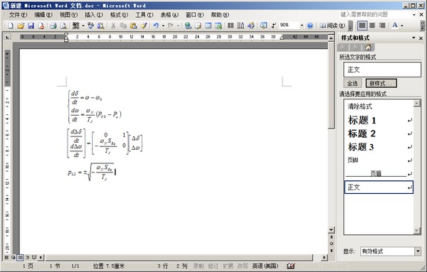 把公式段落的设置保存为样式的方法:公式的格式设置好后(即已通过题注插入编号,并且已通过制表位设置公式居中、编号在右边行末),选中该公式及其编号,点击“格式|样式和格式”,这时在word右方出现“样式和格式”栏,点击该栏上部的“新样式”,即弹出“新建样式”框,将框里的“名称”改为你熟悉的名称,例如改为“my”,然后确定,则“my”就出现在word右边的格式设置栏里。新公式段落应用此样式的方法:题注给新公式编号后,选中公式和编号,在