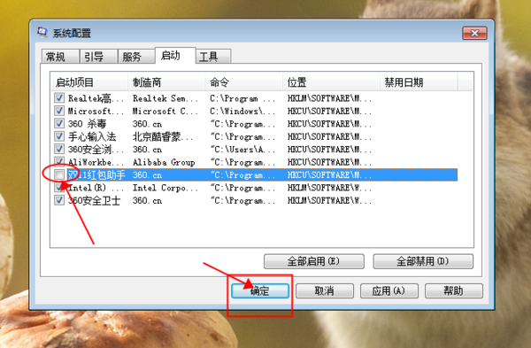 3、在任务管理器中,就能找到目前为止开机启动项和开机启动程序了。比如,选择其中的“双11红包助手3”启动项,去掉前面方框里的打勾,点击确认即可。