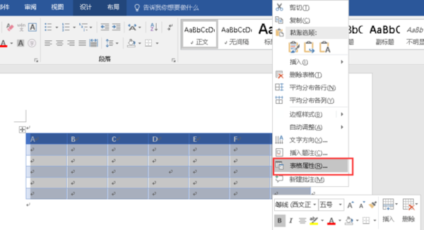 2.选中全部表格,鼠标右键单击,选择“表格属性”。
