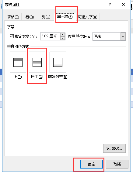 3.在弹出的表格属性对话框中,选择"单元格",垂直对齐方式选择"居中",点击"确定"。