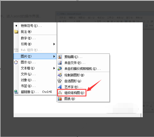 菜单栏——插入——图片——组织结构图:就出现一个“组织结构图”来。