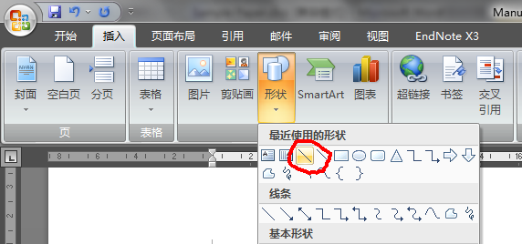 1、打开需要操作的WORD文档,在插入工具中找到形状,并选择“直线”。