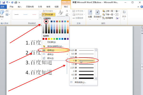 3、松开鼠标在绘图工具中找到并点击“形状轮廓”,设置线条粗细宽度以及颜色。