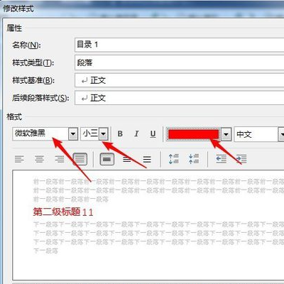 3、对话框中,目录**对应的就是**级标题。选中想要设置的级别后,再点修改,就会弹出格式设置的界面了,这时候你就可以随便设置段落、字体、字号、颜色等等啦