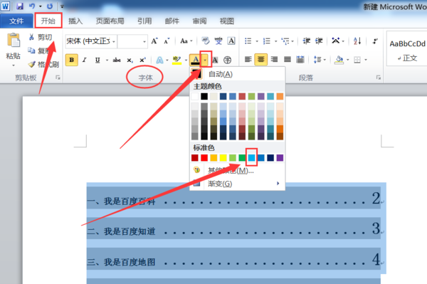 2、在“开始”选项卡中找到“字体”,点击“字体颜色”旁边的下拉按钮,在弹出的颜色选项卡中选择自己需要的颜色即可。