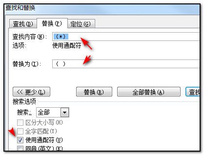 如果( )是英文状态的,要先去掉通配符的勾,然后查找替换为()中文状态的括号。因为在通配符里面,()代表表达式。
