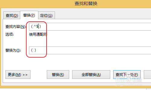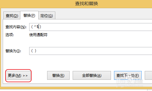 1、打开word文档,单击“开始”菜单下的“替换”命令,在弹出的“查找和替换”对话框中单击“查找内容”右侧的输入框,输入括号,在括号内输入*号,单击“更多”按钮,勾选“使用通配符”复选框。