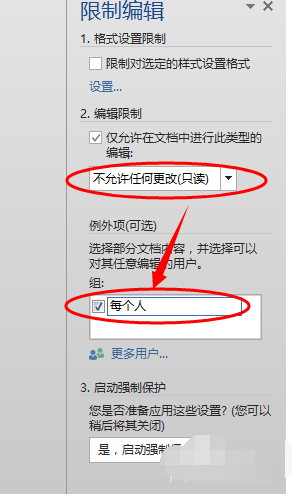 4.点击勾选 仅允许在文档中进行此类型的编辑 ,并在下拉列表中选择 不允许任何更改(只读),在例外项下面的组列表中 单击勾选 每个人。