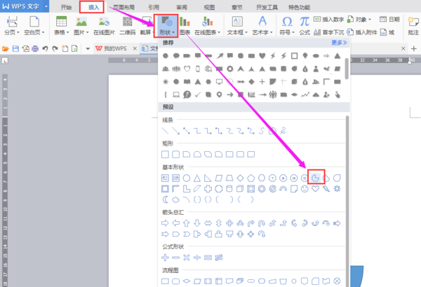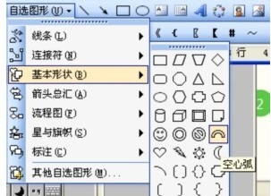 1、单击插入——形状——基本形状——空心弧工具;