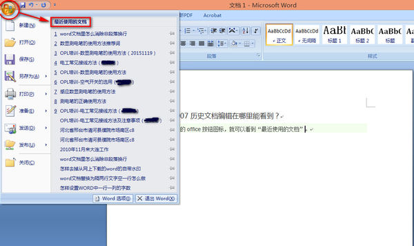 Word2007历史文档编辑在哪里能看到
