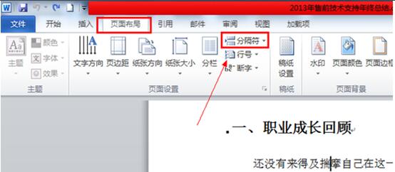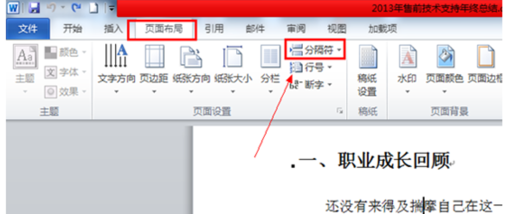 第1步,打开Word2010文档窗口,将光标定位到准备插入分节符的位置。然后切换到“页面布局”功能区,在“页面设置”分组中单击“分隔符”按钮。