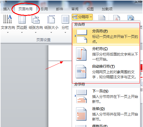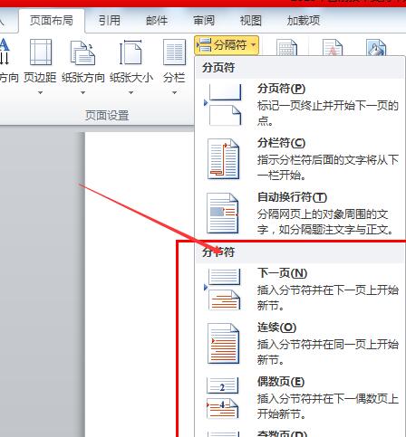 2、在word菜单中选择页面布局,点击分隔符旁边的倒三角,看到其中第一块是分页符,第二块就是分节符了,有4个类型,我们只要根据自己的需求选择即可。