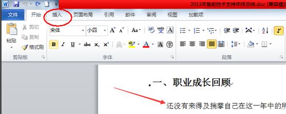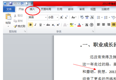 1.打开word2010文档,找到需要编辑插入分页符的位置。找到 菜单栏---插入
