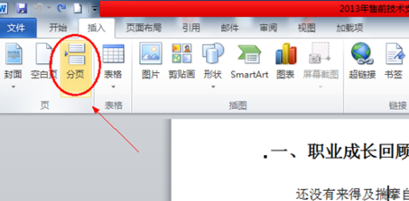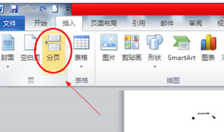 1、进入word2010并打开文档,然后点击“插入”工具栏中的“分页”图标,如图: