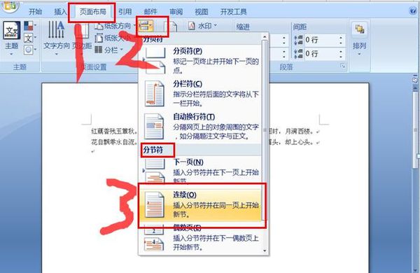 2.点击页面布局——插入分页符和分节符。选择所需要的(连续,下一页,奇数页,偶数页),这里选择连续。