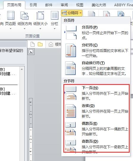 第2步,在打开的分隔符列表中,“分节符”区域列出4中不同类型的分节符: