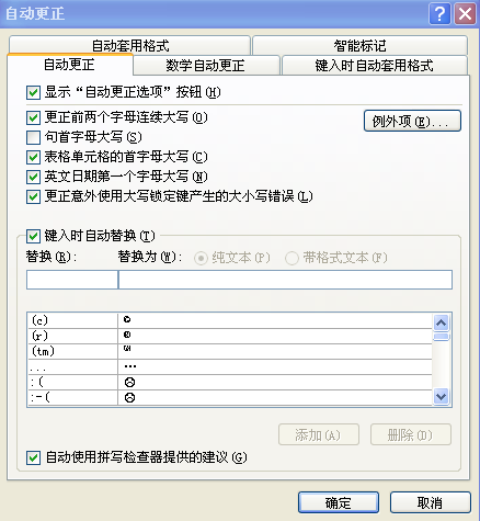 WORD选项--校对--自动更正选项,对话框中有五个选项卡,在里面找找,可以进行设置,检查一下,有没有,如果没有自己添加。