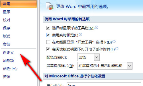 2、然后,在Word选项的界面点击左侧菜单列表中的自定义选项。