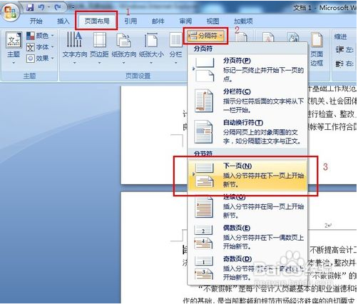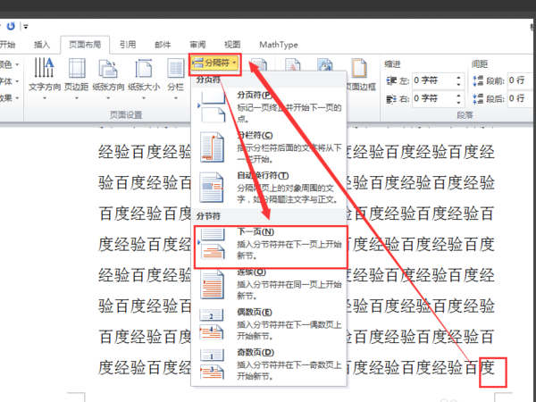 3、在工具栏里“页面布局”中“页面设置”的模块中,找到“分隔符”,在下拉的菜单中选择“”