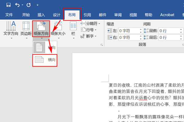 1、首先打开需要更改的word文档(以word 2016为例),点击上方菜单栏“布局”选项卡后再点击“纸张方向”功能,选择“横向”。