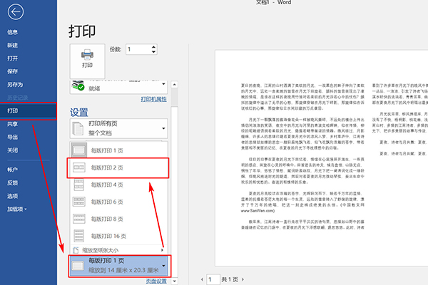 3、然后点击打印设置界面下方的“每版打印1页”,在弹出的选项中选择“每版打印2页”,这样就可以将word的两页打印到一页,分为左右两栏。