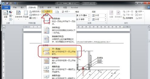 3、接着就是在你想要变成横向的那一页末端使用【分节符】。
