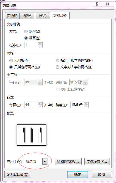 3、选择文档网络,方向改为垂直,应用于改为所选文字即可。