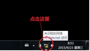 将路由器接通电源,将电脑无线网络启用。点击电脑任务栏托盘“网络”图标(如下图)