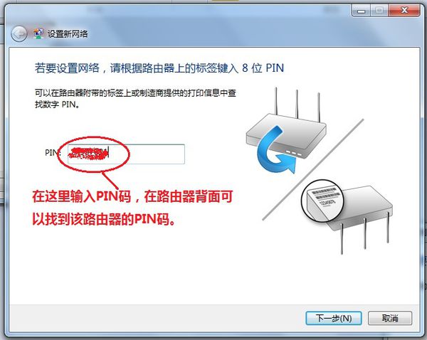 “确定”后会弹出“设置新网络”框,输入PIN码(路由器背面有)(如下图)