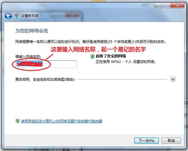 下一步,输入网络名称(随意起个易记的名子)