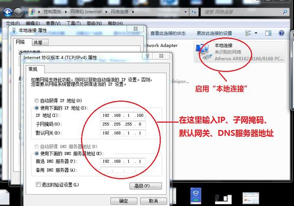 1、电脑设置:启用本地连接,禁用无线连接。本地连接属性(TCP/IP)设置:IP地址:192.168.1.x(可以是2-254间任意数),子网掩码:255.255.255.0默认网关:192.168.1.1DNS地址:192.168.1.1(如下图)