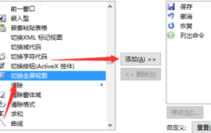 2.弹出“Word选项”对话框,在左侧的下拉列表中选择“不在功能区中的命令”,拖动滚动条选择“切换全屏视图”命令,单击“添加”按钮将其添加到右侧区域中。