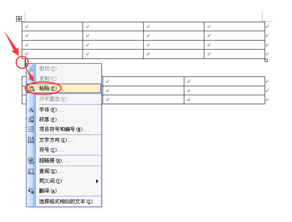 3、在最接近前一个表格的那个空行(回车符)的地方再次点击鼠标右键,选择“粘贴”。