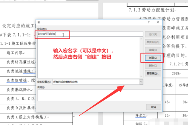 2 word---视图---宏----查看宏----输入宏名:SelectAllTables----点击创建(参图1)