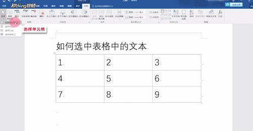 3、如果需要选中一个单元格,就把鼠标点击那个单元格,然后点击菜单栏表格工具下的“布局”,点击“选择”,再点击“选择单元格”即可。