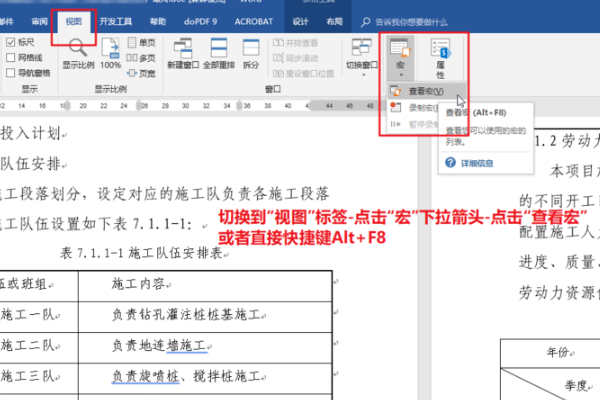 1、打开word文档,切换到“视图”选项、标签、点击“宏”选项,然后下拉箭头点击“查看宏”选项或者直接快捷键Alt+F8;