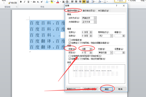 2、在缩进和间距中找到段前间距,在输入框直接输入“6磅”,然后点击确定按钮即可。