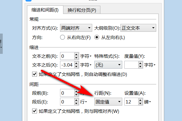 3、然后在缩进和间距的页面中找到间距,将行距设置为固定值即可。